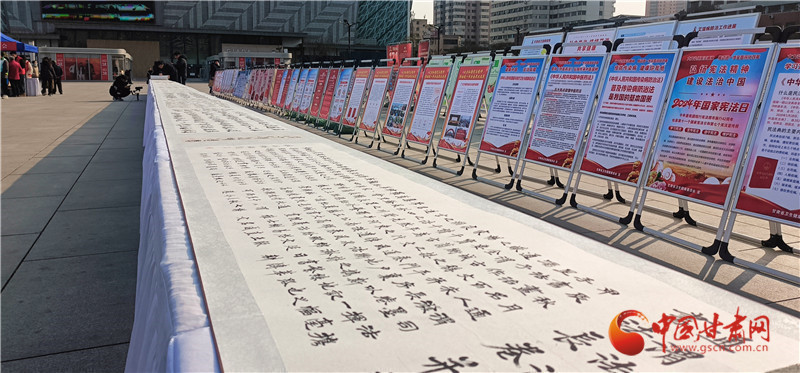 活動現(xiàn)場,省委宣傳部、省委政法委、省法院、省檢察院等20余家單位結(jié)合行業(yè)實際,宣傳憲法,普及法律知識,為群眾提供法律咨詢。為了豐富普法載體,讓群眾在互動參與中學習法律知識,活動展出了由定西市通渭縣司法局聯(lián)合書法家、師生群體、法官、檢察官、公安民警等各行各業(yè)工作人員創(chuàng)作的百米《書·法》長卷,鐫刻法治精神,書寫法律法規(guī)?,F(xiàn)場還表演了精彩的文藝節(jié)目。