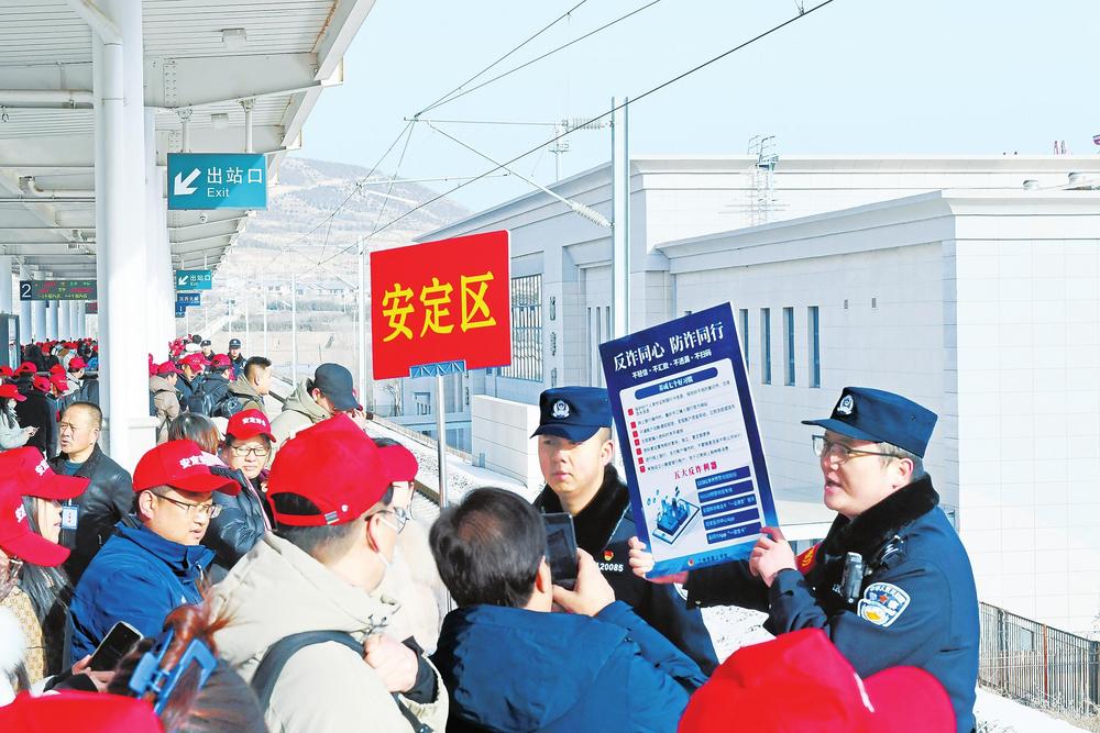 記者了解到,這批務工人員來自定西市各縣區(qū),既有返崗務工人員,也有新聘務工人員。為保障此次高鐵務工專列順利開行,蘭州鐵路公安處定西北站派出所積極與定西北車站、客運部門通聯(lián),專門開辟“綠色通道”,暢通進站、安檢、檢票等進站環(huán)節(jié),劃定專門候車進站區(qū)域,同時增派警力逐一引導務工人員有序進站,幫助提拿大件行李、講解防范電信詐騙小妙招,用心用情保障務工旅客乘車安全。