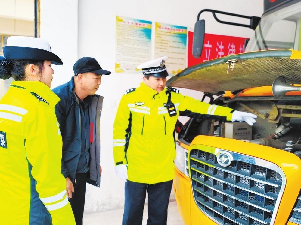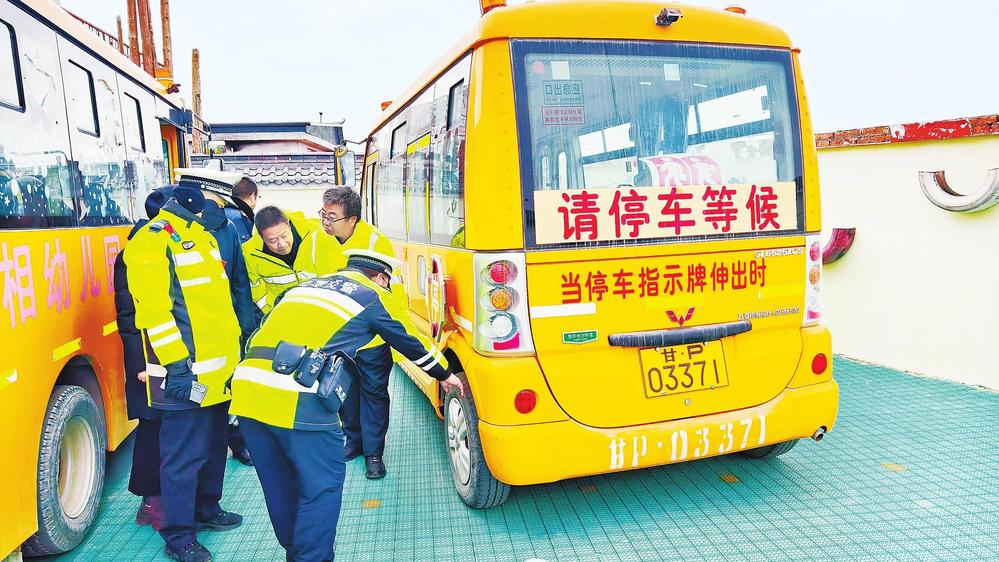 民警在檢查幼兒園校車。開學在即,為保障學生上下學乘車安全,2月18日,臨潭縣公安局交警大隊聯(lián)合縣交通運輸局對校車開展“安全體檢”。 新甘肅·甘肅法治報記者金凡裕攝