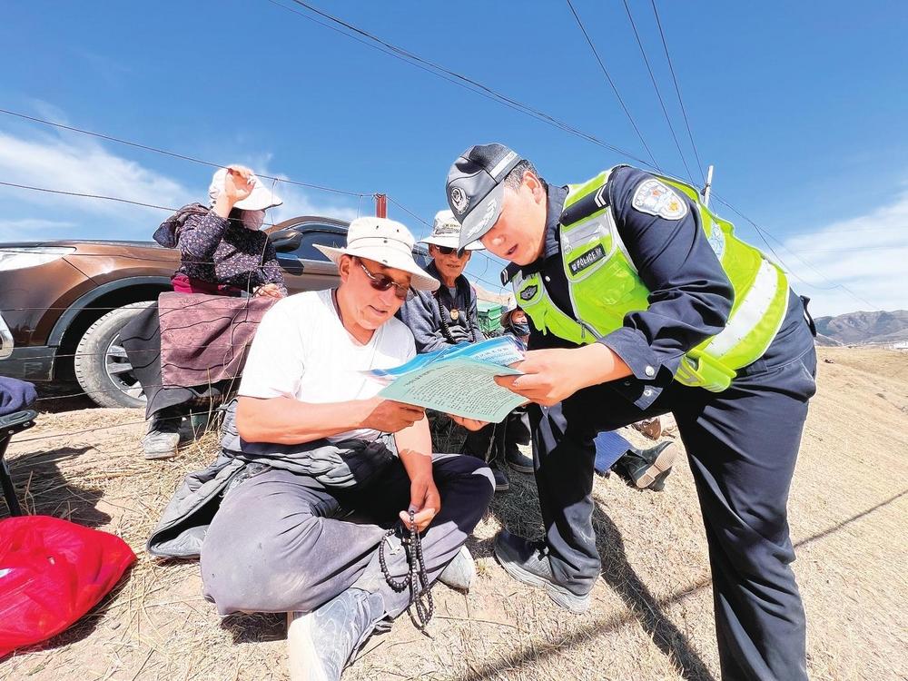 民輔警向群眾講解交通安全知識。近日,碌曲縣公安局交警大隊民輔警借助夏澤灘春季賽馬活動有利時機,開展“美麗鄉(xiāng)村行”交通安全巡回宣傳活動。 新甘肅·甘肅法治報記者金凡裕攝