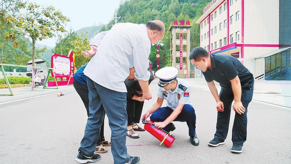 消防宣傳員向群眾講解消防器材的使用方法。