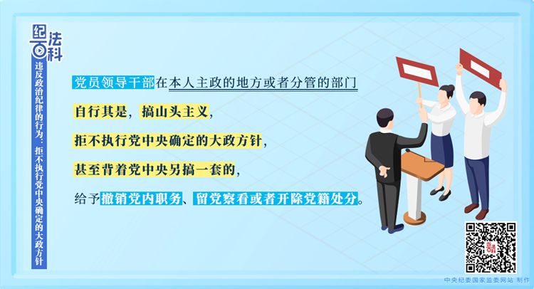 《中國(guó)共產(chǎn)黨紀(jì)律處分條例》第五十六條第一款規(guī)定,黨員領(lǐng)導(dǎo)干部在本人主政的地方或者分管的部門自行其是,搞山頭主義,拒不執(zhí)行黨中央確定的大政方針,甚至背著黨中央另搞一套的,給予撤銷黨內(nèi)職務(wù)、留黨察看或者開除黨籍處分。
