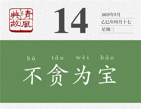 這則小故事,有人稱作“宋人獻寶”,有人稱作“子罕辭寶”。前者是從宋人的視角看問題,他以玉為寶:“玉人以為寶也,故敢獻之。”后者是從子罕的視角看問題,他以不貪為寶:“我以不貪為寶,爾以玉為寶,若以與我,皆喪寶也。”后人以“不貪為寶”為典,喻指清正廉潔,品德高尚。
