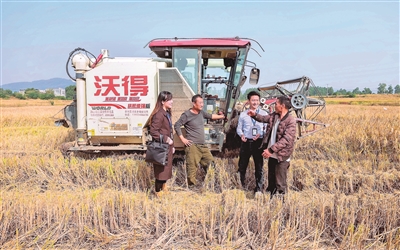 糧食安全是“國之大者”。安徽省含山縣紀(jì)委監(jiān)委聚焦高標(biāo)準(zhǔn)農(nóng)田建設(shè)管理中的突出問題開展一線走訪,推動(dòng)“糧田”變“良田”。圖為該縣紀(jì)檢監(jiān)察干部在環(huán)峰鎮(zhèn)城北村水稻收割現(xiàn)場(chǎng)了解相關(guān)情況。歐宗濤 攝