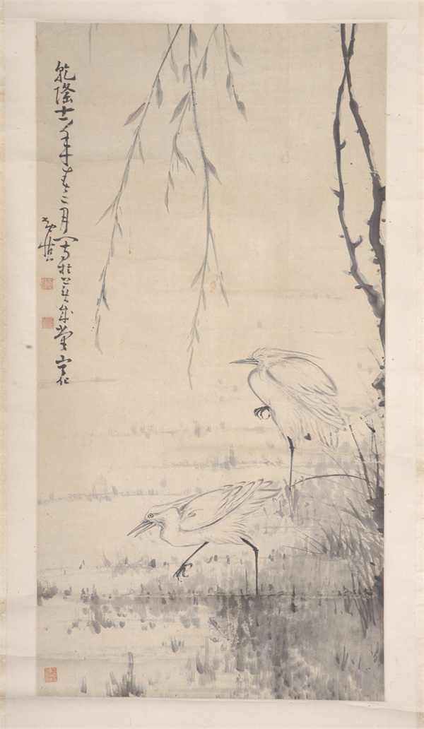 清代,水墨設(shè)色花鳥畫立軸,紙本,作者黃慎??v高1126厘米,橫寬57.4厘米。款署“乾隆十一年春二月寫于蕪成堂寧化黃慎”。鈐“黃慎”白文方印,“癭瓢”白文方印。柳枝自畫面上方垂下,疏落的柳葉隨風(fēng)搖曳。池塘兩只白鷺,一只閉目獨(dú)立,一只行走覓食。黃慎,福建寧化人,書畫家,為“揚(yáng)州八怪”之一。