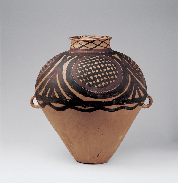 馬廠類型,蘭州市土谷臺(tái)出土??趶?3.9厘米,底徑12厘米,高44.5厘米。泥質(zhì)橙黃陶。施黑,紅彩,口內(nèi)繪一圈帶紋和連弧紋,頸部繪菱格紋,肩腹部用黑紅兩色繪二方連續(xù)的四大圓圈紋,圓圈內(nèi)填方格紋。腹中部繪黑色帶紋和一圈水波紋。四大圓圈紋,顯示了馬廠類型彩陶的獨(dú)特文化風(fēng)格。