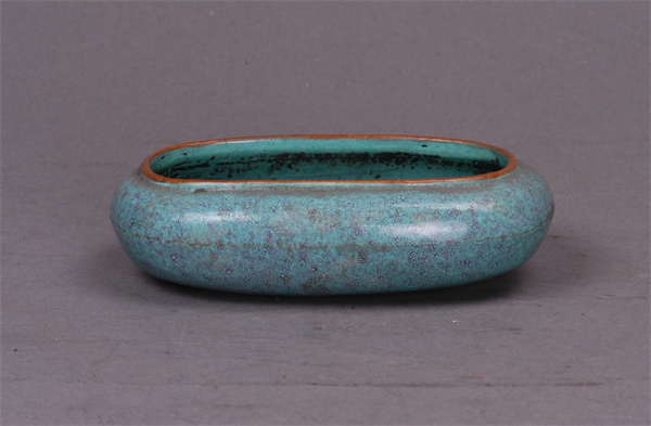 清代,高2.8厘米,口徑8.8×5厘米。橢圓口,扁腹。通體施藍綠釉,醬黃釉口。