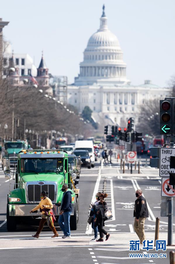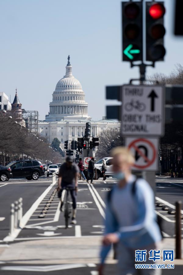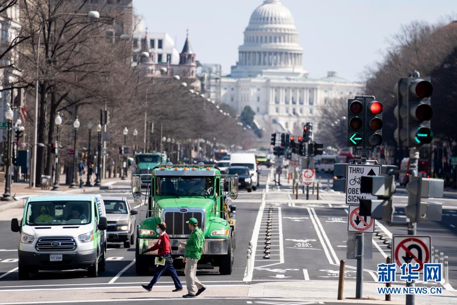 3月10日,在美國(guó)首都華盛頓,人們經(jīng)過國(guó)會(huì)大廈附近的一處路口。新華社記者劉杰攝