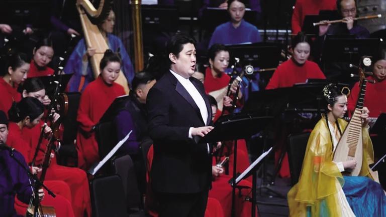 國(guó)樂(lè)版《敦煌·慈悲頌》,根據(jù)民族樂(lè)隊(duì)的特點(diǎn)傾情打磨創(chuàng)作,將壁畫(huà)的戲劇情節(jié)用音樂(lè)呈現(xiàn),通過(guò)壁畫(huà)與音樂(lè)旋律的結(jié)合,展現(xiàn)偉大的敦煌藝術(shù),彰顯中華傳統(tǒng)文化中向善向上的精神力量。圖為演出現(xiàn)場(chǎng)。