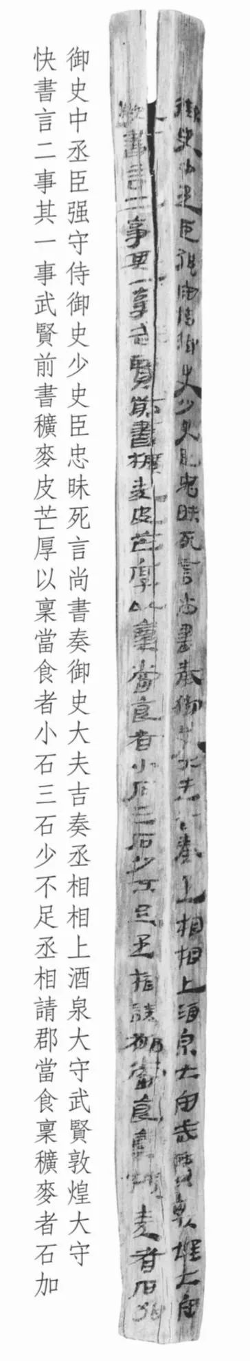 此簡為漢宣帝回復(fù)酒泉太守“辛武賢”和敦煌太守“快”奏疏的恩準(zhǔn)詔書,簡文記載的是皇帝詔書中對(duì)兩太守奏疏內(nèi)容的復(fù)述。從簡文內(nèi)容看,酒泉太守辛武賢和敦煌太守快給朝廷的奏疏主要涉及兩件事情:一是辛武賢認(rèn)為作為糧草的穬麥因皮厚芒長,如按規(guī)定每人發(fā)放小石三石,會(huì)造成實(shí)際數(shù)量的不足,所以他請(qǐng)求皇帝每石加發(fā)若干。另一件事顯然是敦煌太守快的上書,但文字未能容納于此簡,故不得而知。