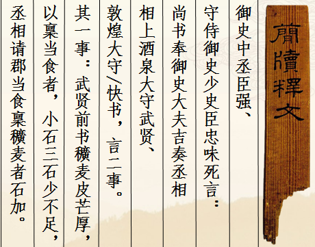 另據(jù)張德芳先生考證,此簡所言史實(shí)或與漢宣帝神爵年間對(duì)羌作戰(zhàn)有關(guān)。漢宣帝神爵元年(前61)西羌作亂,辛武賢被任命為破羌將軍,與敦煌太守快等發(fā)兵配合后將軍趙充國對(duì)羌作戰(zhàn),神爵二年(前60)羌事結(jié)束后辛武賢赴任酒泉太守。簡文中稱辛武賢為“酒泉太守”,或許是神爵二年(前60)羌事結(jié)束后,辛武賢在面對(duì)平定西羌戰(zhàn)爭(zhēng)過程中發(fā)現(xiàn)的一些弊端諸如糧食發(fā)放不足數(shù)等問題向朝廷提出改善的建議。