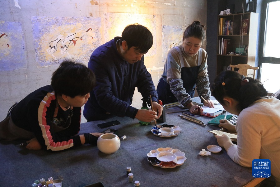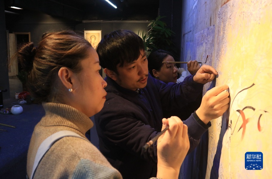 2月22日,在敦煌小鎮(zhèn)鳴沙書(shū)院,藝術(shù)工作者張杰龍(中)指導(dǎo)學(xué)員臨摹敦煌壁畫(huà)。
