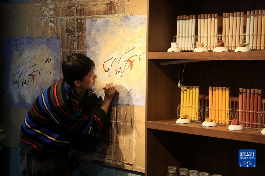 2月22日,在敦煌小鎮(zhèn)鳴沙書(shū)院,來(lái)自陜西的學(xué)員吳恩梵學(xué)習(xí)敦煌壁畫(huà)臨摹技藝。
