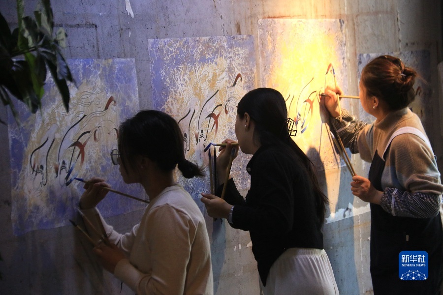 2月22日,在敦煌小鎮(zhèn)鳴沙書(shū)院,學(xué)員學(xué)習(xí)敦煌壁畫(huà)臨摹技藝。