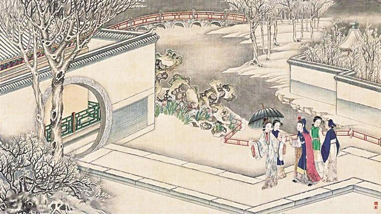 著名紅學家周汝昌曾評論清代孫溫《紅樓夢》繪本是“紅樓瑰寶”,其中一處細節(jié)就配得上這種評論。賈政攜寶玉和眾客游覽大觀園的繪制中,孫溫用了13幅畫并以焦點游移的手法,一路將賈政等人的路線詳細描繪出來,跟著畫面而走,觀者可以看到瀟湘館、蘅蕪院、沁芳亭、沁芳橋等大觀園景觀,令人嘆為觀止。