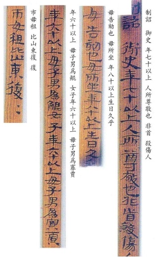 1981年出土于武威磨嘴子漢墓中的“王杖詔書(shū)令冊(cè)”簡(jiǎn)則是關(guān)于古代敬老養(yǎng)老制度的法律法規(guī),堪稱(chēng)古代“老年人權(quán)益保護(hù)法”。原簡(jiǎn)背面有編號(hào)第一至第廿七,共27簡(jiǎn),但第15簡(jiǎn)已缺失,余26簡(jiǎn)首尾俱全。正面有556個(gè)字,雖歷經(jīng)千年,上面墨書(shū)的漢隸依然清晰可見(jiàn)。簡(jiǎn)文內(nèi)容豐富,記載明確,既有撫恤鰥寡孤獨(dú)廢疾之人的具體做法,又有敬老養(yǎng)老高年賜王杖的明確規(guī)定。