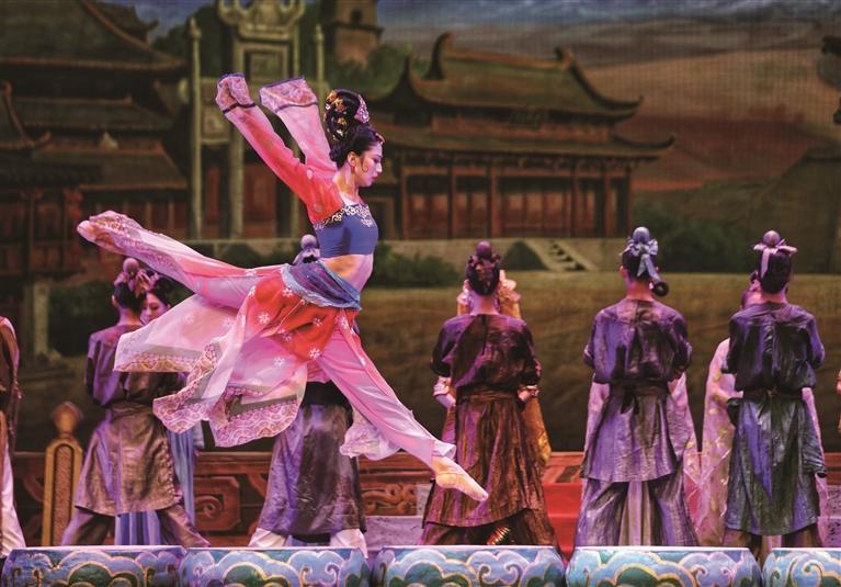 舞劇《絲路花雨》取材于敦煌莫高窟壁畫藝術(shù),融合了中國(guó)古典舞、印度舞、黑巾舞、波斯馬鈴舞、波斯酒舞、土耳其舞、盤上舞、新疆舞等各種藝術(shù)形式于一劇。