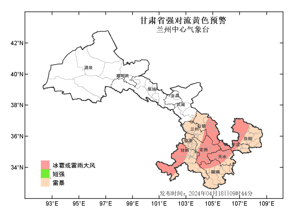 中國(guó)甘肅網(wǎng)4月18日訊(西北角·中國(guó)甘肅網(wǎng)記者 沈文剛)4月18日9時(shí)44分,蘭州中心氣象臺(tái)發(fā)布強(qiáng)對(duì)流黃色預(yù)警:預(yù)計(jì)今天白天到夜間,武威以東大部分地方有雷暴;其中,白銀、定西、甘南、天水等市州部分地方及蘭州、隴南、平?jīng)?、慶陽等市局部地方有雷雨大風(fēng)或冰雹;甘南、隴南、定西、天水、白銀、蘭州、平?jīng)?、慶陽等州市局部地方有短時(shí)強(qiáng)降水,最大小時(shí)雨強(qiáng)為20-30毫米。