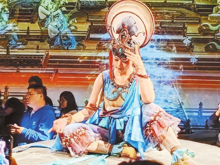 “真是一場(chǎng)酣暢淋漓的敦煌樂舞盛宴。雖然這趟旅程我們還沒有去敦煌莫高窟,但看罷這場(chǎng)演出,已經(jīng)對(duì)莫高窟壁畫有了初步的認(rèn)知。莫高窟壁畫的精華部分,借助高科技手段和演員的精彩演繹,在我們眼前立體延展開來(lái),同時(shí)劇場(chǎng)內(nèi)大量復(fù)刻了佛龕、蓮花臺(tái)、藻井等特色形制,讓我們‘一眼入境’,帶我們走進(jìn)歷史深處,觸摸文明脈動(dòng)。”浙江游客王松攜家人觀看《樂動(dòng)敦煌》后,發(fā)出贊嘆。