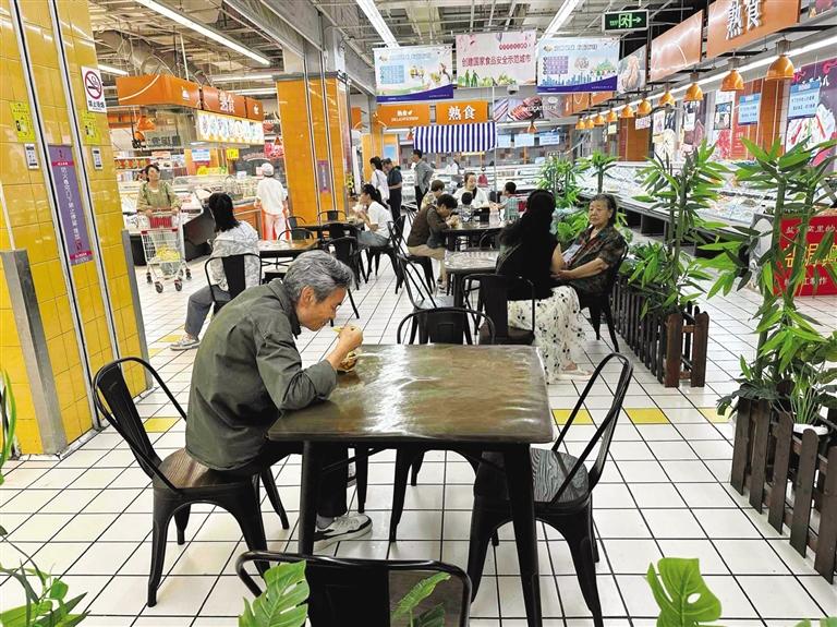 超市里的“平價(jià)食堂”,成為打造一刻鐘便民生活圈的重要載體。“超市周邊的居民、上班族、學(xué)生、酒店差旅客群的基礎(chǔ)比較大,所以增加快餐、堂食也是超市的一項(xiàng)便民舉措。”超市里升騰起的煙火氣,也讓超市的來(lái)客率明顯提升,“周末時(shí),油條的銷(xiāo)量能達(dá)到1000根、豆腐腦能賣(mài)到500碗,不管是檔口、自助收銀機(jī)都有排隊(duì)的顧客。”