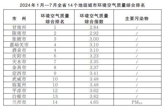 2024年1月—7月,全省14個(gè)地級(jí)城市環(huán)境空氣質(zhì)量綜合排名由高到低分別為:甘南州、隴南市、張掖市、嘉峪關(guān)市、酒泉市、慶陽(yáng)市、天水市、金昌市、定西市、武威市、臨夏州、平?jīng)鍪?、白銀市、蘭州市。