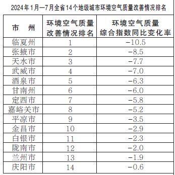 2024年1月—7月,全省14個(gè)地級(jí)城市環(huán)境空氣質(zhì)量改善情況排名由好到差分別為:臨夏州、張掖市、天水市、武威市、酒泉市、甘南州、定西市、嘉峪關(guān)市、平?jīng)鍪?、金昌市、白銀市、隴南市、蘭州市、慶陽(yáng)市。