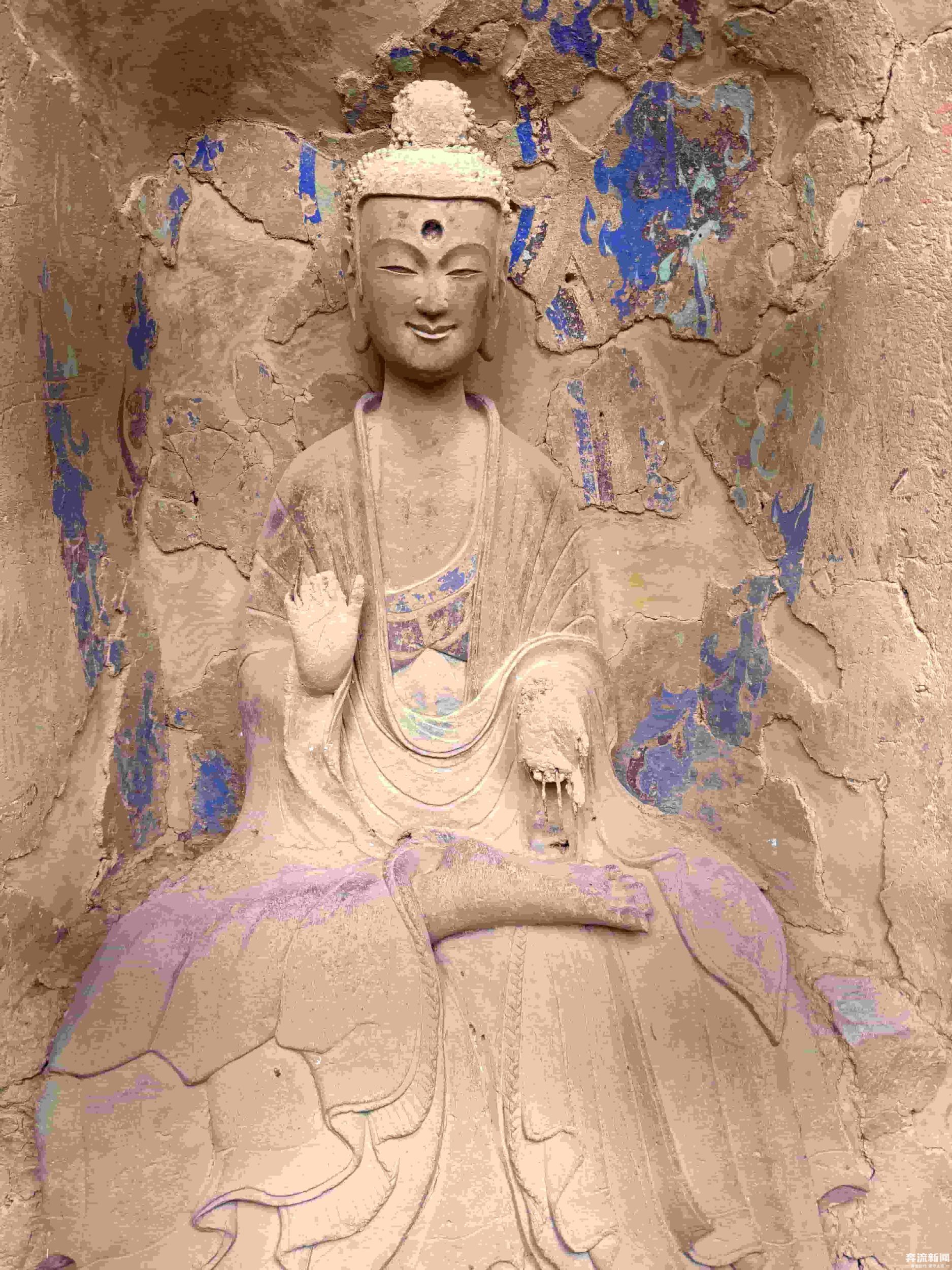 窟內(nèi)佛像造型各異,色彩鮮艷,既有莊嚴肅穆的佛祖、菩薩,也有生動活潑的弟子、天王。這些造像中,雖然有石雕和個別的木雕,但主要以泥塑為主,體現(xiàn)了多朝代中國佛教泥塑造像藝術(shù)的發(fā)展演變規(guī)律。奔流新聞記者了解到,在技法上,工匠們運用了圓雕、浮雕、鏤雕等多種技藝,使得佛像栩栩如生,富有強烈的立體感和動感。麥積山石窟也因為其獨特的“東方微笑”與精美的泥塑藝術(shù)聞名于世,被譽為“東方雕塑陳列館”。