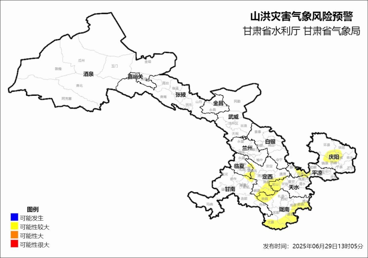 根據(jù)省氣象局《重大氣象信息專(zhuān)報(bào)》(2025年甘氣第10期),未來(lái)十天甘肅省多降水天氣,具有對(duì)流性強(qiáng)、小時(shí)雨強(qiáng)大、累積雨量大等特點(diǎn),洪水災(zāi)害風(fēng)險(xiǎn)高。6月29日13時(shí),省水利廳、省氣象局聯(lián)合發(fā)布山洪災(zāi)害氣象風(fēng)險(xiǎn)預(yù)警:預(yù)計(jì),6月29日14時(shí)至30日14時(shí),白銀市(景泰縣),武威市(古浪縣),定西市(臨洮縣、渭源縣、通渭縣、隴西縣、漳縣、岷縣),臨夏州(廣河縣、東鄉(xiāng)縣、康樂(lè)縣),甘南州(臨潭縣、卓尼縣、舟曲縣、迭部縣),天水市(秦安縣、甘谷縣、武山縣、張家川縣),隴南市(宕縣、禮縣、武都區(qū)、成縣、文縣、康縣、徽縣、兩當(dāng)縣),平?jīng)鍪校o寧縣、崆峒區(qū)、華亭市、莊浪縣),慶陽(yáng)市(西峰區(qū)、慶城縣、環(huán)縣、華池縣、鎮(zhèn)原縣)等地區(qū)發(fā)生山洪災(zāi)害可能性較大(黃色預(yù)警)。