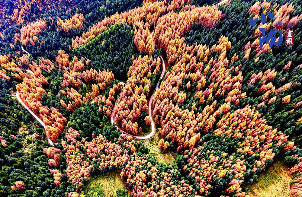 從空中俯瞰,彩林點綴,層層疊疊、錯落有致,在這片彩色畫卷中,一條小路蜿蜒伸展,似銀蛇游走,為這靜謐的畫面增添了靈動的韻律?!?/p>