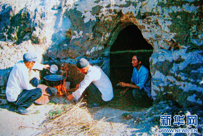 1983年,“六老漢”第一代治沙人在“地窩子”生火做飯(資料圖片)。(八步沙林場供圖)
