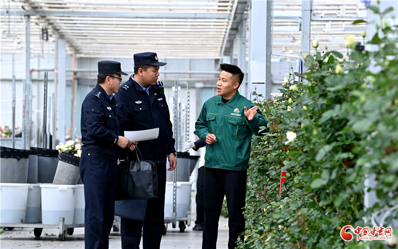 圖為紅古分局花莊派出所民輔警在蘭州一家農(nóng)企的多肉種植基地宣傳安全生產(chǎn)知識(shí)