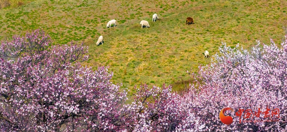 翠綠草地上,羊群悠然啃食青草,與爛漫花海相映成趣