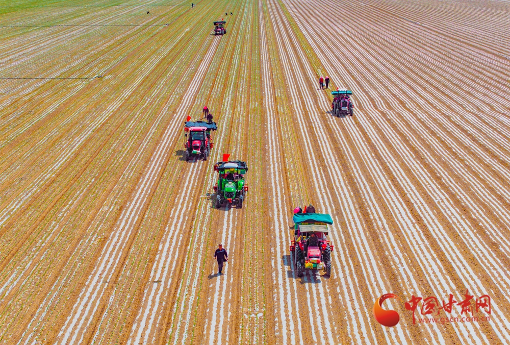 春日,走進(jìn)定西臨洮的田間地頭,一壟壟覆膜蜿蜒如銀色絲帶,在暖陽下泛起粼粼波光。洮河水畔,杏花初綻,村民們正彎腰點(diǎn)種、培土壓膜。新翻的泥土氣息混著花香彌漫田間。農(nóng)機(jī)轟鳴處,白膜與藍(lán)天相映,勾勒出黃土高原上最動(dòng)人的春耕畫卷。