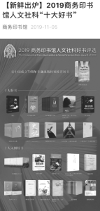 “商務(wù)印書(shū)館人文社科好書(shū)評(píng)選”被中央電視臺(tái)等媒體稱為“年度圖書(shū)榜單風(fēng)向標(biāo)”。每每公布后,央媒及主流媒體都會(huì)予以報(bào)道,同時(shí)在新媒體平臺(tái)也會(huì)進(jìn)行系列宣傳,比如2019年的好書(shū)評(píng)選人民日?qǐng)?bào)官方微信發(fā)布后一天內(nèi)的閱讀量便超過(guò)了888萬(wàn)。