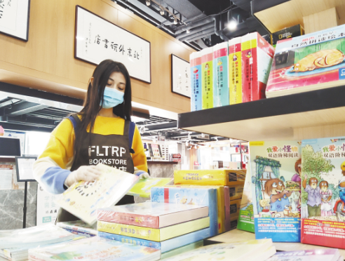 3月25日,北京外研書店?yáng)|升科技園店店員在打包外賣圖書。