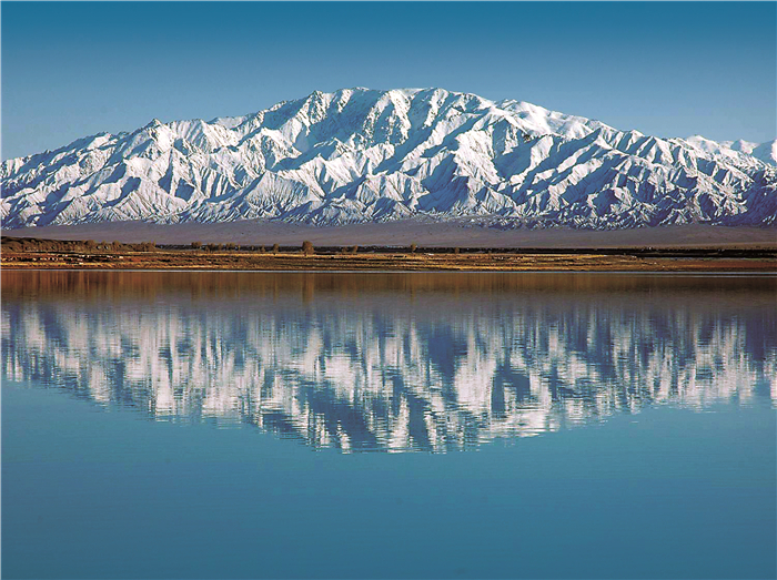 國道蜿蜒山寂靜,渾是冰雪嶺。疊嶂復(fù)層巒,瀚海藍(lán)天,雙塔妝湖鏡。