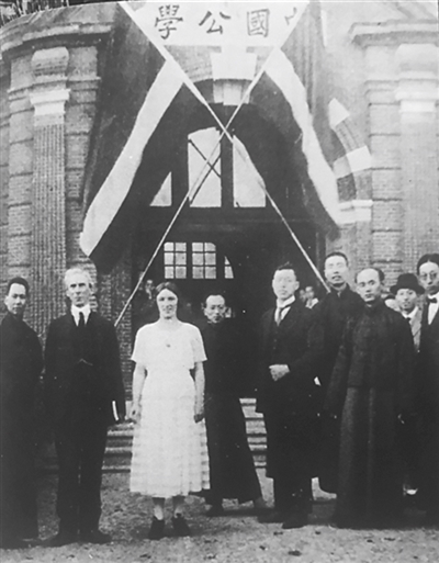 羅素(左二)與勃拉克在中國(guó)公學(xué)前合影。