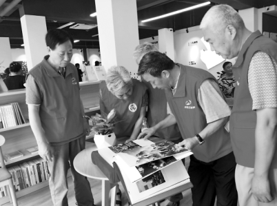 社區(qū)退休黨員在“紅旗書屋”里翻看大型圖冊《中國》。