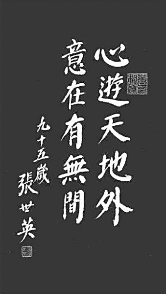 張先生今年正好百歲,照過去的觀念,當然是長壽了。但是在我們的心目中,張先生現(xiàn)在去世,還是太早了,令我們無限悲痛!前年(2018年)12月18日,《張世英書法集》出版,我們在燕南園56號院舉行新書沙龍。張先生在會上講話,講得那么好,講得那么清晰,一個字不多,一個字不少。當時張先生已是98歲高齡了。在開會前我和張先生聊天。我說:“我感到學哲學能使人長壽。”張先生說:“我同意你的看法。”為什么學哲學能使人長壽?就因為哲學學得好,能使人有高遠的精神境界,就是張先生書法集里這兩句話:“心游天地外,意在有無間。”這種高遠的精神境界,必然使人長壽。大家常說:“期之以米,望之以茶。”當時張先生已經(jīng)過了米壽,我們相信他必然健康地走向茶壽?,F(xiàn)在卻突然去世,不是太早了嗎?