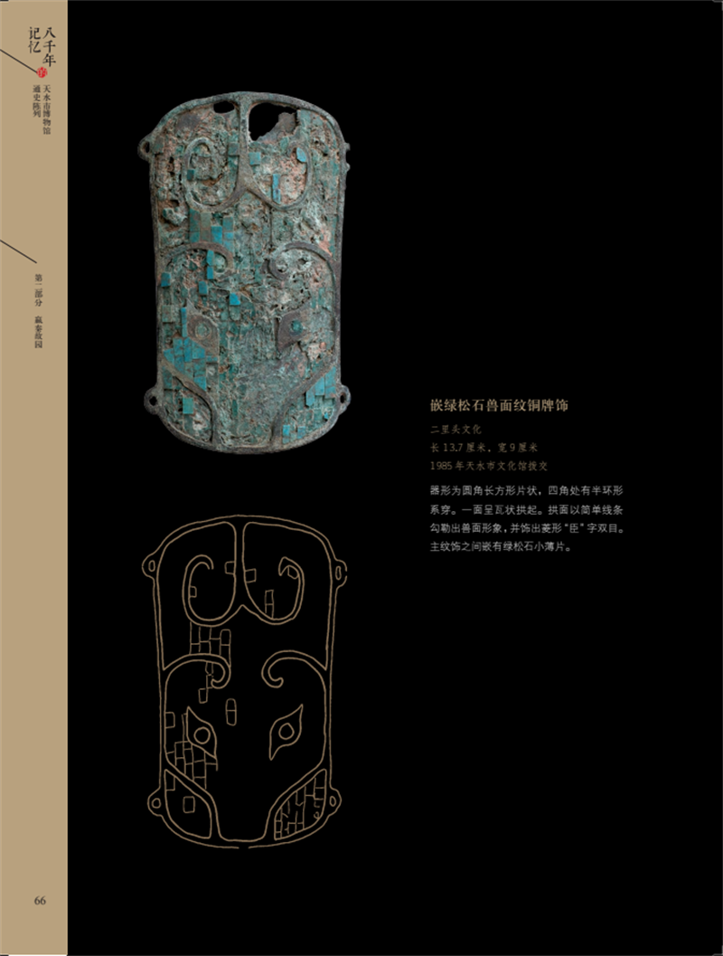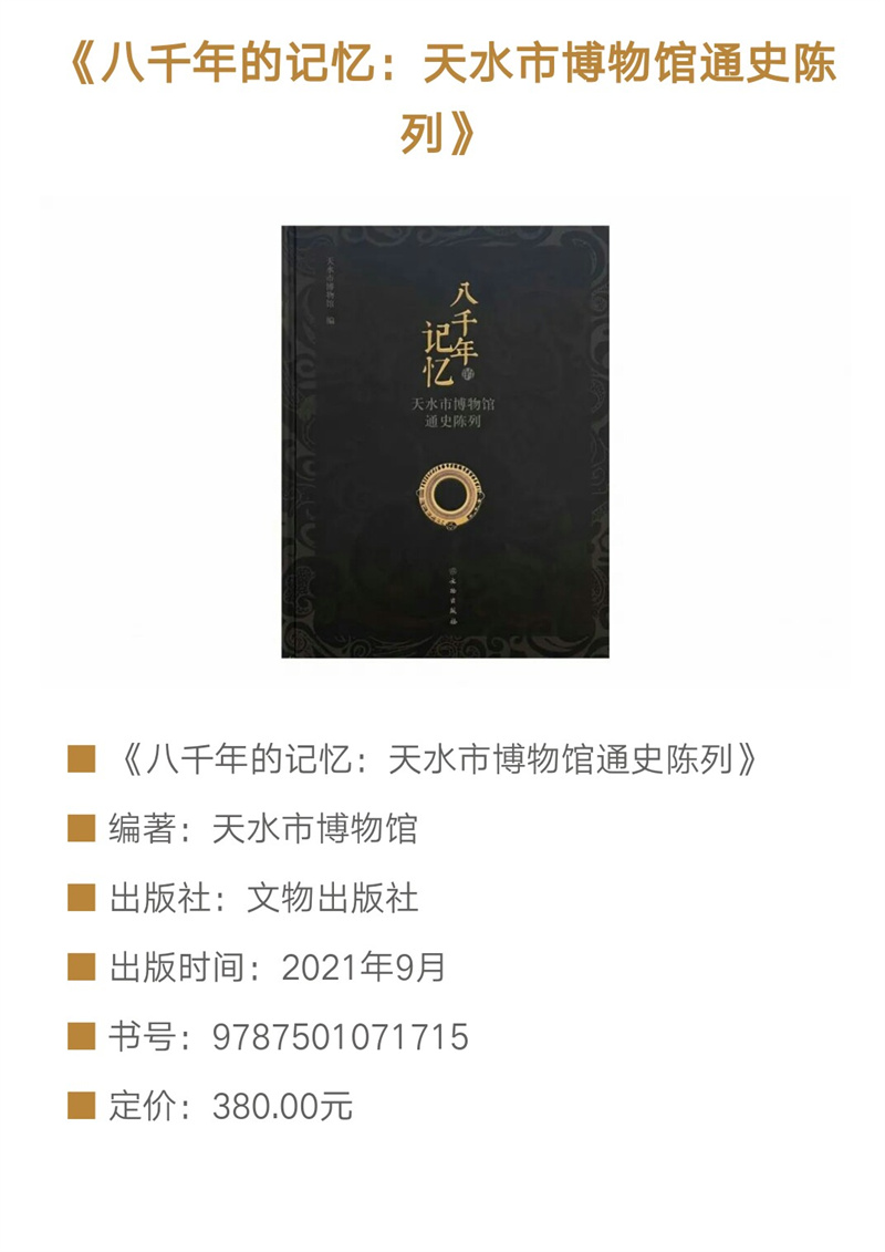 《八千年的記憶——天水市博物館通史陳列》圖錄,是在2018年天水市博物館通史陳列展覽提升改造基礎上提煉而成,以天水市博物館能夠反映天水歷史文化面貌的館藏精品文物為重點,輔之以天水地區(qū)出土的藏于其他文物機構(gòu)的重點文物,旨在展示天水八千年歷史文脈和文明成就。全書共分為文明曙光、嬴秦故園、兩漢物華、魏蜀兵戈、渭水梵音、隋唐盛景、茶馬大市、古城遺韻8個部分,擷集天水文物精粹,在展現(xiàn)天水自舊石器時代至明清時期完整歷史序列的同時,突出了獨具天水特色的歷史文化資源。