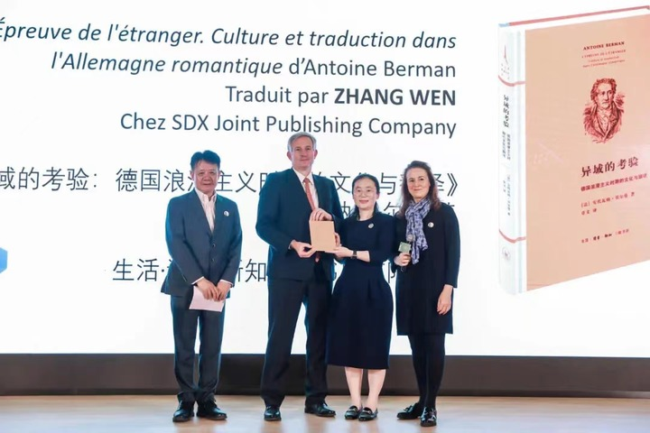 法國(guó)駐華大使羅梁(左二)為社科類獲獎(jiǎng)譯者頒獎(jiǎng)。法國(guó)駐上海總領(lǐng)事館供圖