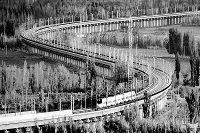 伴隨改革開放大潮,中國發(fā)展日新月異,高鐵、快遞、“天眼”望遠(yuǎn)鏡、粵港澳大橋等新事物都被詩人們?nèi)谌朐娦小D為行駛中的蘭新高鐵列車。新華社發(fā)(蔡增樂攝)