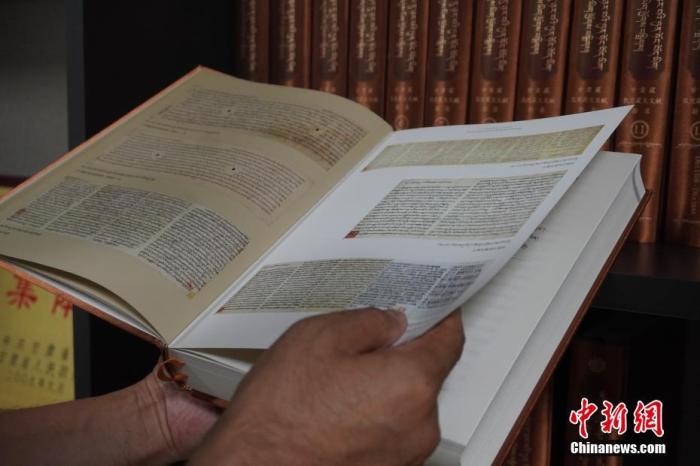 8月26日,甘肅蘭州,甘肅民族出版社資料室內(nèi)收藏的《甘肅藏敦煌藏文文獻(xiàn)勘錄》。該叢書(shū)共30卷,約2205余萬(wàn)字,收錄了6700余件甘肅藏敦煌藏文文獻(xiàn),系國(guó)內(nèi)外首次以全文錄入的方式出版。 中新社記者 九美旦增 攝