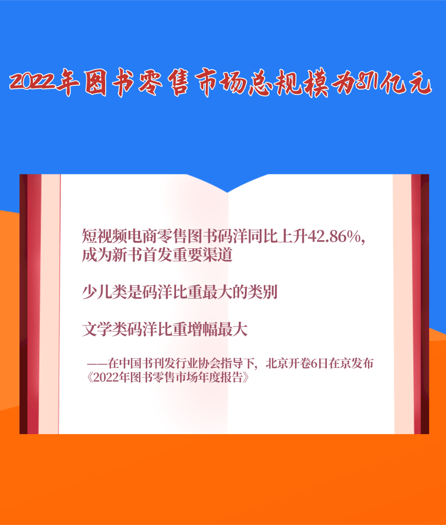 1月6日,在中國書刊發(fā)行業(yè)協會指導下,北京開卷信息技術有限公司在京發(fā)布《2022年圖書零售市場年度報告》。報告顯示,2022年我國圖書零售市場碼洋規(guī)模為871億元。短視頻電商零售圖書碼洋同比上升42.86%,碼洋占比趕超實體書店,成為新書首發(fā)重要渠道。