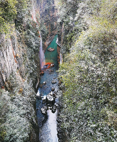 雪花飄飄,沿棧道往下走,山林被染成一幅黑白山水畫。風(fēng)雨橋在地縫之上凌空飛舞,仿佛是通往地心的鑰匙。約75米深的云龍絕壁垂直下切,狹長,呈U型,崖壁皺紋黑灰,宛若剛出鞘的寶劍閃著寒光。底下是云龍河,水淺,清澈,叮叮咚咚,增添些許歡快,而讓地縫變得富有激情的是沐撫盆地流出的7條瀑布,其中最美的是五彩黃龍瀑布。瀑布從60米高的峭壁跌落下來,纖細(xì),飄灑,婀娜。“銀花下散布水臺,混沌鑿破山根隈。”從暗河流出的水含黃鐵礦,把巖壁和卵石刷洗得斑斕,連河水也變得絢麗。