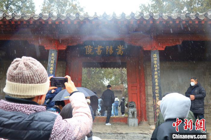中新網(wǎng)鄭州2月23日電 (王迪)春雪依依,古柏森森,紅墻青瓦間傳出幾句儒家經(jīng)典的吟誦之聲……在22日的“寫(xiě)意中國(guó)——探訪漢字起源”主題宣傳采訪中,記者探訪了河南登封市區(qū)北約二公里處嵩山南麓的嵩陽(yáng)書(shū)院。是日清晨,登封忽降細(xì)雪,映襯得整個(gè)嵩陽(yáng)書(shū)院愈發(fā)肅穆。美景難得,引得游人紛紛駐足欣賞,拍照留念。