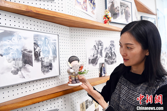 圖為2月20日,陳天竺向中新社記者介紹讀者出版集團推出的“太空閱讀者”手辦。 中新社記者 九美旦增 攝