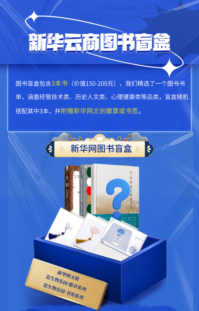 本次活動(dòng)由新華云商聯(lián)合機(jī)械工業(yè)出版社、中國科學(xué)技術(shù)出版社、光塵文化、湛廬文化共同推出。盲盒內(nèi)圖書涵蓋經(jīng)管技術(shù)類、歷史人文類、心理健康類等品類,將隨機(jī)搭配三本,可能與您的藏書重復(fù),或不符合您的閱讀愛好,請(qǐng)您慎重選擇理性購買。同時(shí),盲盒內(nèi)會(huì)附贈(zèng)新華網(wǎng)文創(chuàng)徽章或書簽。