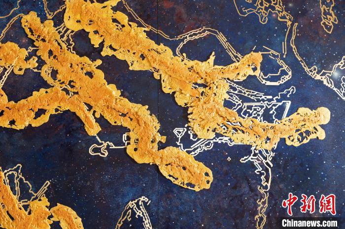 記者了解到,這幅熔銅壁畫采用國家級非遺銅雕技藝,結合熔銅藝術、釉彩著色等創(chuàng)新技藝制作而成,從設計、制作、誕生,全程歷時一年,難度很大。壁畫以朱炳仁手繪的星空“云水墨”制作,用大面積深藍宇宙為底,采用熔銅藝術構成繁星點點。