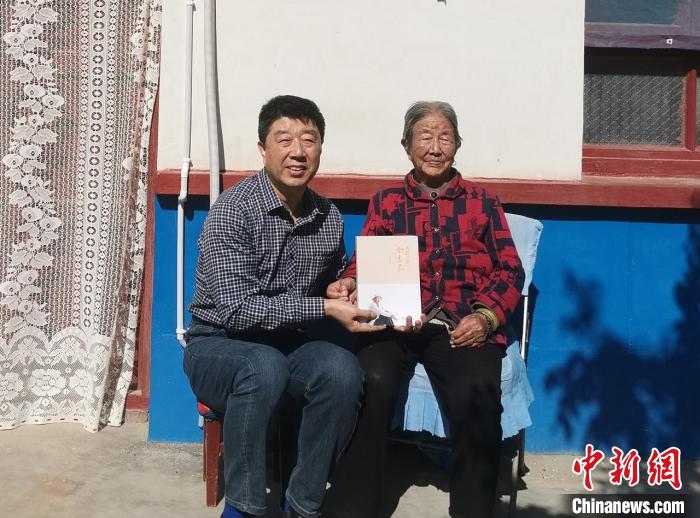 金雷泉拿著其出版作品《我的父親金吉泰》與母親在家中院內(nèi)合影。(資料圖)受訪者供圖